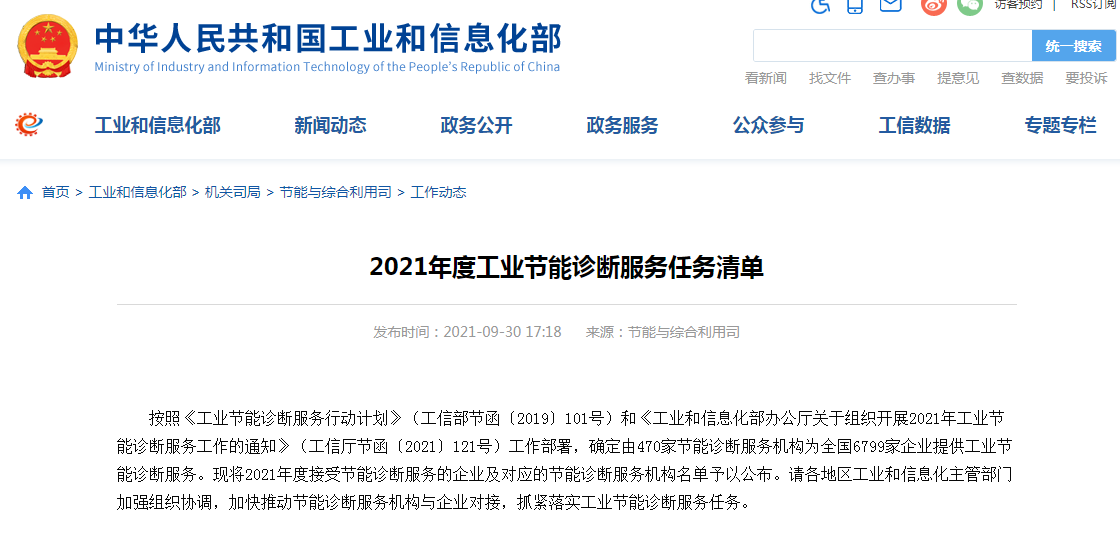 根據(jù)2021年9月30日,國家工業(yè)和信息化部《工業(yè)節(jié)能診斷服務(wù)行動計(jì)劃》(工信部節(jié)函〔2019〕101號)和《工業(yè)和信息化部辦公廳關(guān)于組織開展2021年工業(yè)節(jié)能診斷服務(wù)工作的通知》(工信廳節(jié)函﹝2021﹞121號)工作部署。