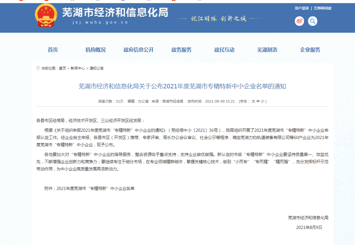 近日,經(jīng)蕪湖市經(jīng)濟和信息化局嚴格審核評定,授予我公司“蕪湖市專精特新中小企業(yè)”榮譽稱號。