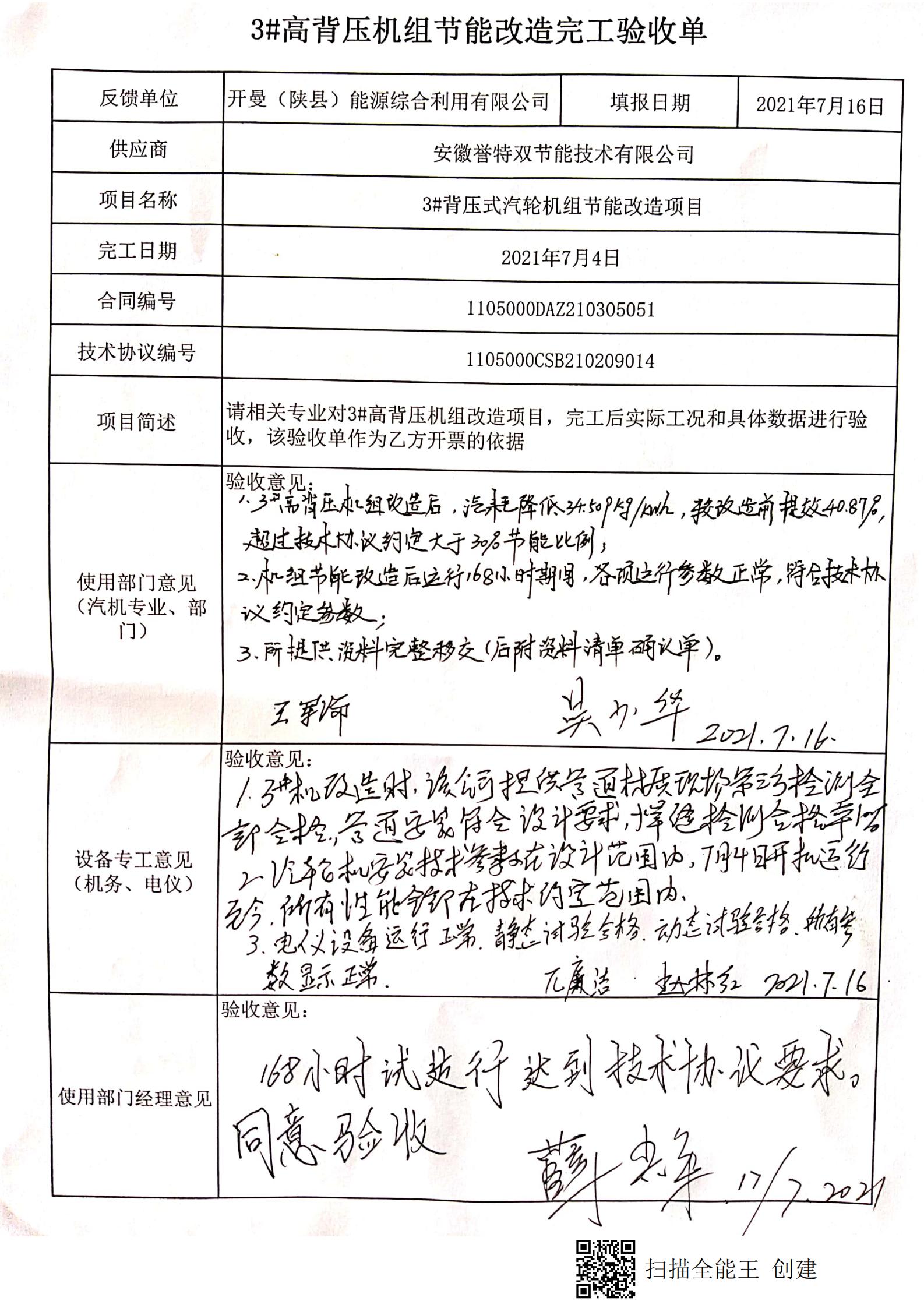 近日,我公司客戶中企五百?gòu)?qiáng)企業(yè)——杭州錦江集團(tuán)三門峽開(kāi)曼(陜縣)能源綜合利用有限公司7.5MW高背壓式汽輪機(jī)組節(jié)能改造EPC項(xiàng)目順利通過(guò)工程驗(yàn)收,在此表示熱烈祝賀。
