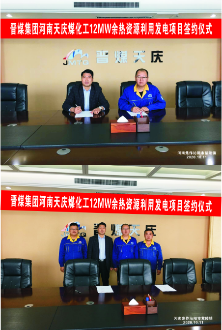 2020年10月12日上午,公司順利簽訂中國五百強晉煤集團天慶煤化工余熱余壓資源綜合利用12MW發(fā)電項目。