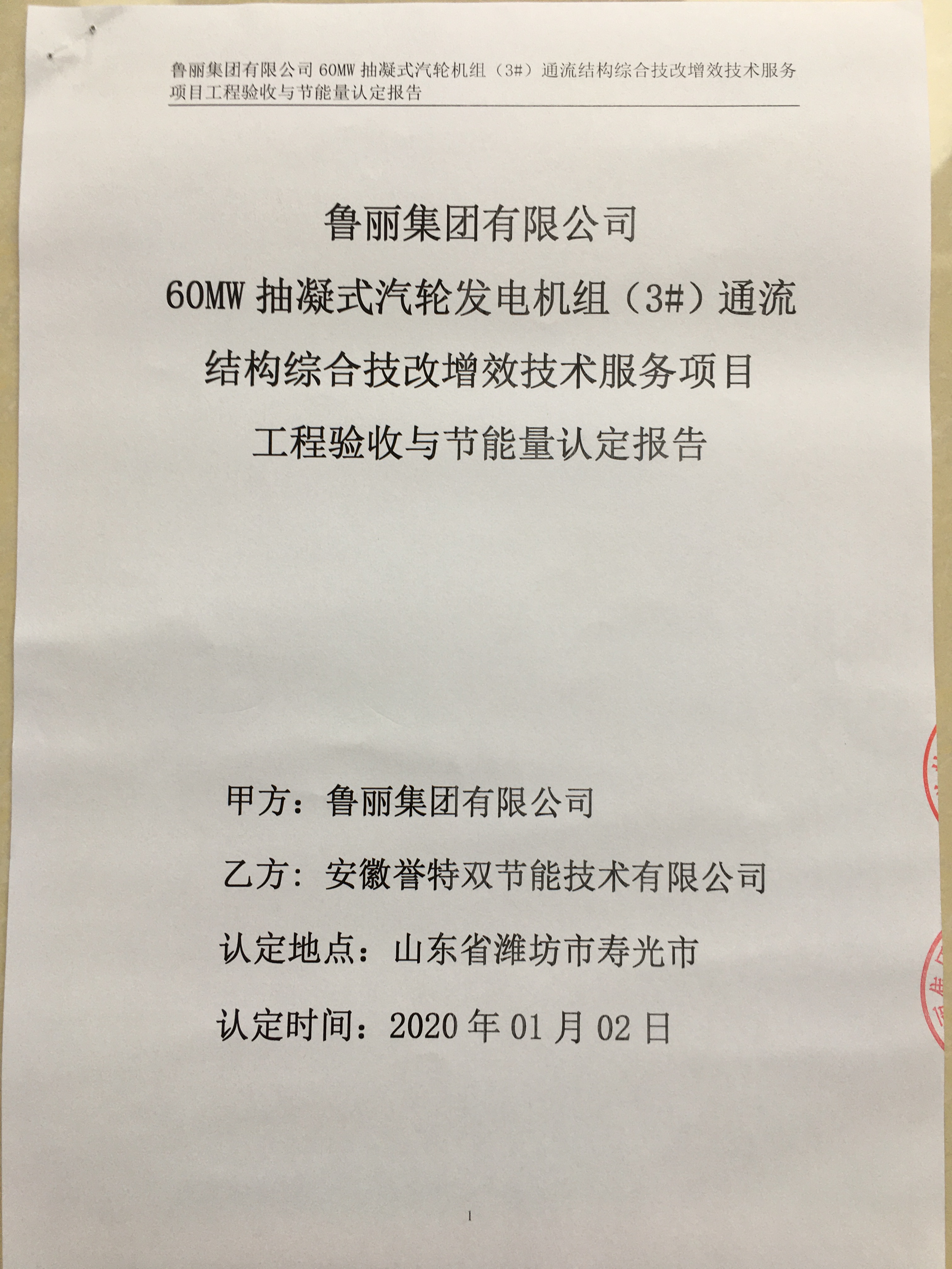 2020年1月2日上午,我公司技術(shù)服務(wù)項(xiàng)目——魯麗集團(tuán)有限公司60MW雙抽凝式汽輪機(jī)組通流結(jié)構(gòu)綜合技改提效項(xiàng)目,通過節(jié)能量認(rèn)定和工程驗(yàn)收。