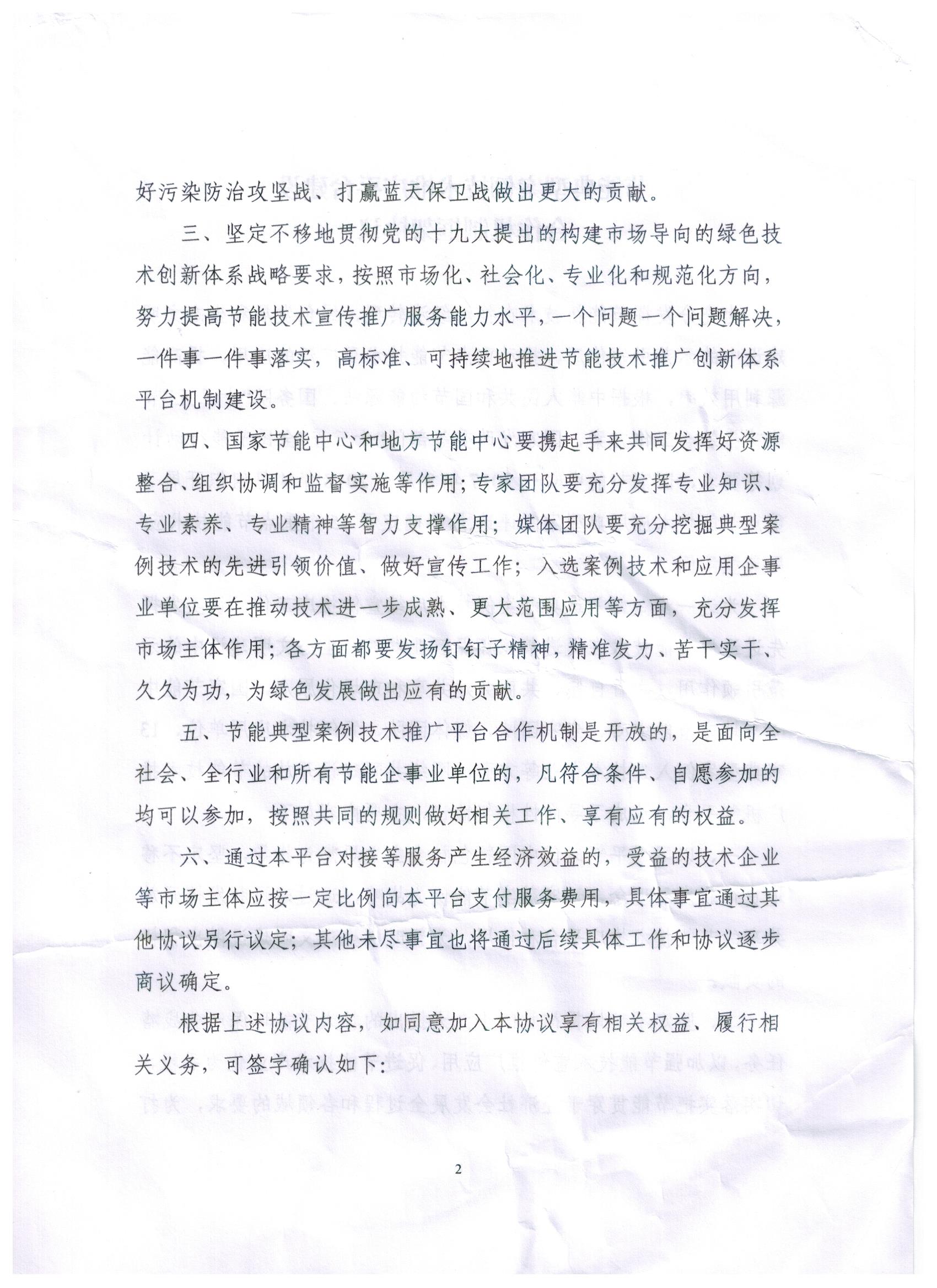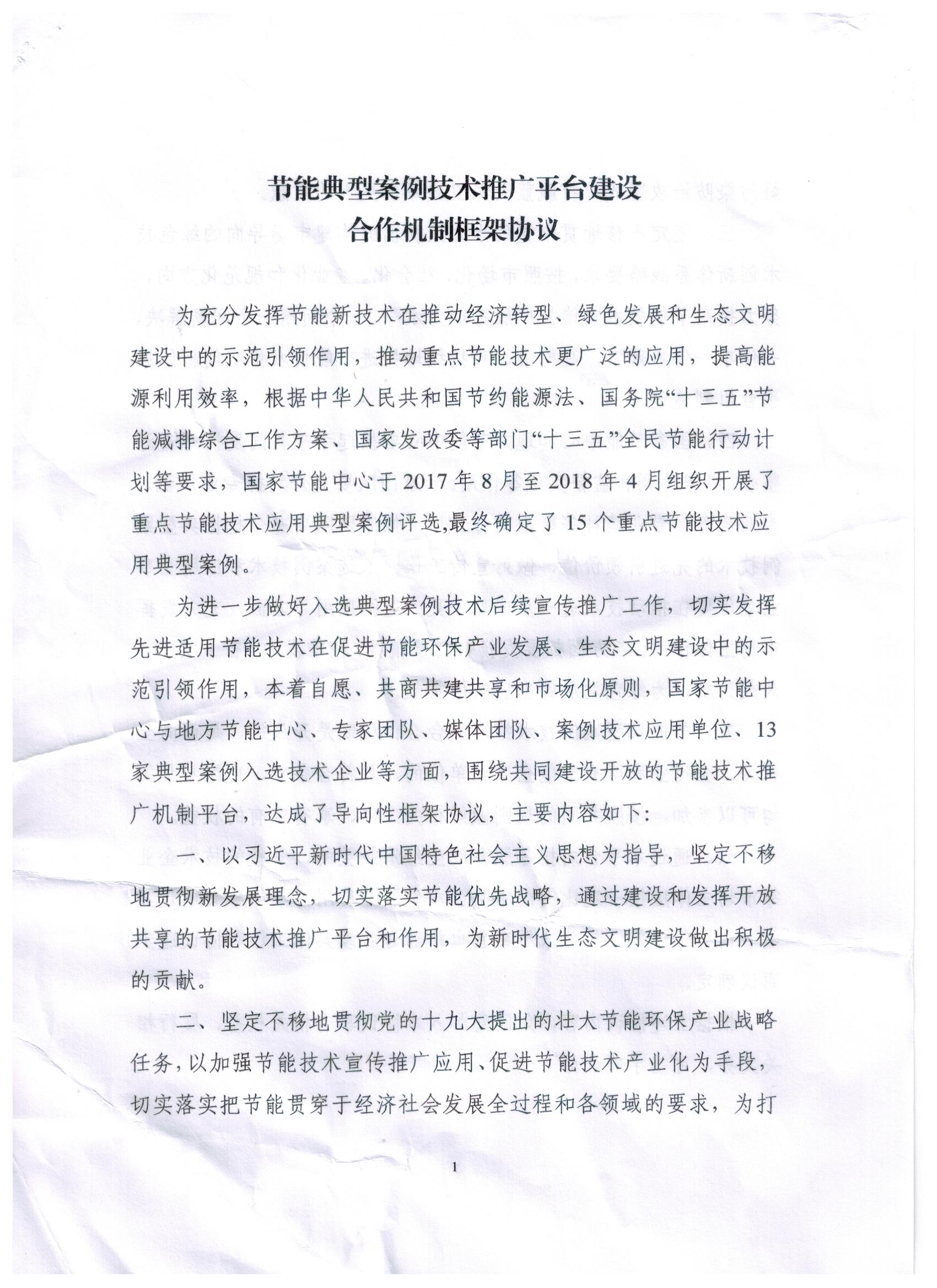 在對(duì)接會(huì)議現(xiàn)場(chǎng),我公司與國(guó)家節(jié)能中心達(dá)成戰(zhàn)略合作意向,并進(jìn)行了現(xiàn)場(chǎng)簽約。國(guó)家節(jié)能中心的節(jié)能技術(shù)推廣合作機(jī)制從去年9月建立后,目前已簽約企業(yè)單位已76家,包括了技術(shù)企業(yè)、用能單位、研發(fā)機(jī)構(gòu)、宣傳媒體等,致力于打造一個(gè)開(kāi)放、共建、共享的推廣平臺(tái)。