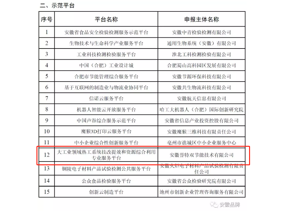 近日,我公司——大工業(yè)領(lǐng)域熱工系統(tǒng)技改提效和資源綜合利用專業(yè)服務(wù)平臺,經(jīng)安徽省經(jīng)信廳,認(rèn)定為安徽省第二批省級服務(wù)型制造示范平臺,全省共計評定出15個專業(yè)性服務(wù)示范平臺,含金量高,社會影響力強(qiáng)。
