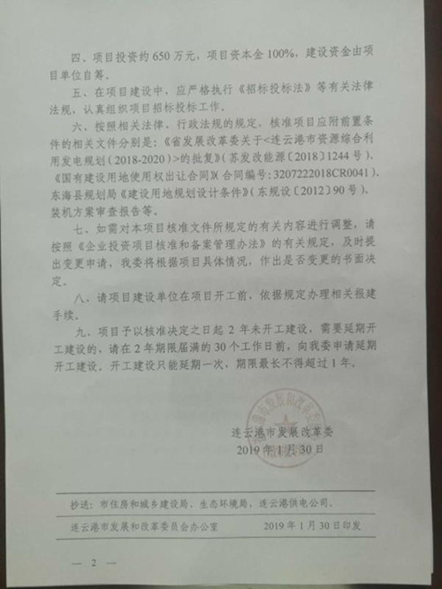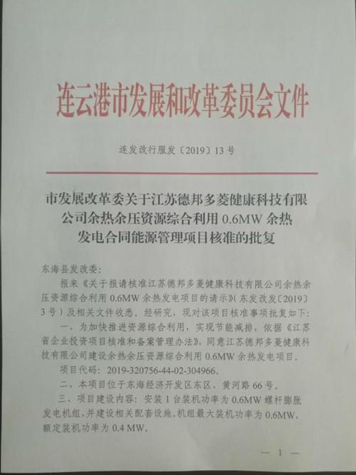該項(xiàng)目當(dāng)前進(jìn)展順利,經(jīng)大力推動(dòng),已順利獲取《江蘇省發(fā)展改革委關(guān)于<連云港市資源綜合利用發(fā)電規(guī)劃(2018-2020)>的批復(fù)》(蘇發(fā)改能源〔2018〕1244號(hào))、《連云港市發(fā)展改革委關(guān)于江蘇德邦多菱健康科技有限公司余熱余壓資源綜合利用0.6MW余熱發(fā)電合同能源管理項(xiàng)目核準(zhǔn)的批復(fù)》(連發(fā)改行服發(fā)〔2019〕13號(hào))、《東??h發(fā)改委關(guān)于報(bào)請(qǐng)核準(zhǔn)江蘇德邦多菱健康科技有限公司余熱余壓資源綜合利用0.6MW余熱發(fā)電項(xiàng)目的請(qǐng)示》(東發(fā)改發(fā)〔2019〕3號(hào))、《裝機(jī)方案審查報(bào)告》等文件和項(xiàng)目核準(zhǔn)批文。