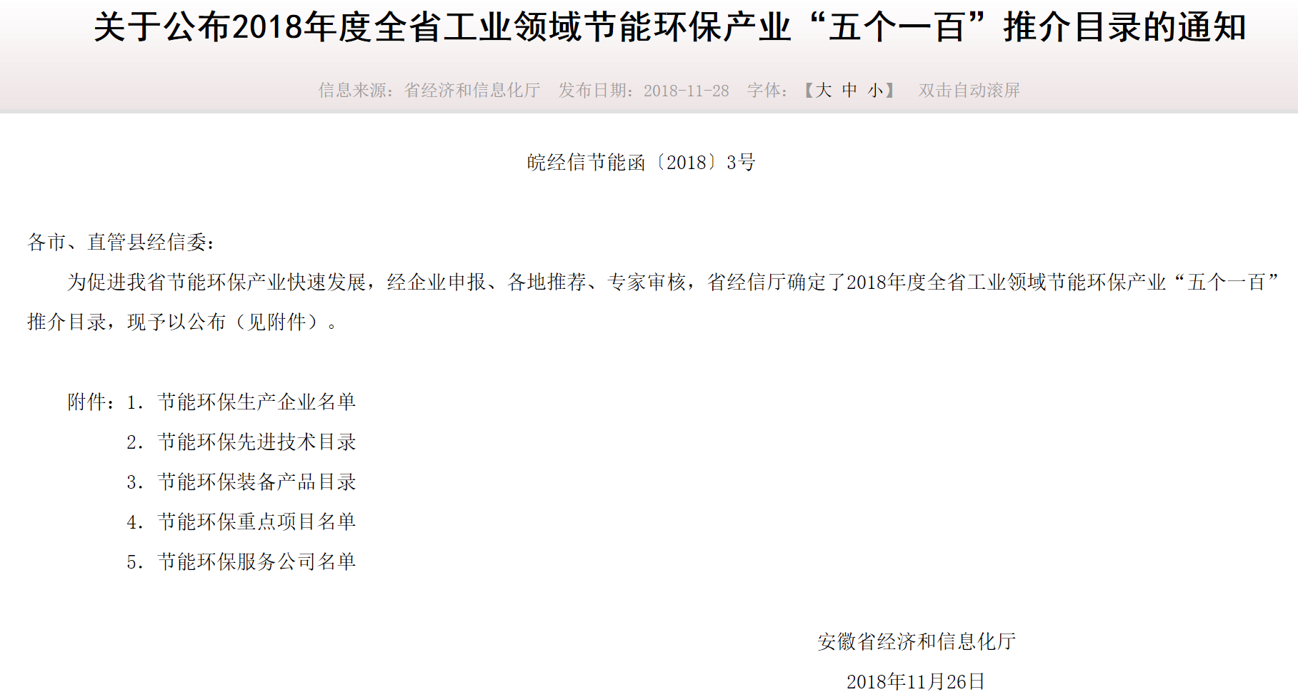 熱烈祝賀我公司節(jié)能環(huán)保先進技術和重點節(jié)能項目并列入選安徽省2018年度全省工業(yè)領域節(jié)能環(huán)保產(chǎn)業(yè)“五個一百”推介目錄