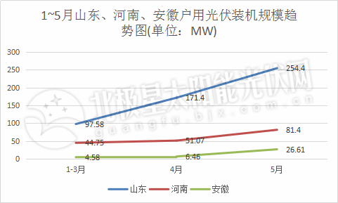 從整體來看,戶用市場(chǎng)已經(jīng)回暖,以山東、河南、安徽等為代表的省份裝機(jī)規(guī)模直線上升,其中,山東上升幅度較大,1-3月新增97.58MW,4月新增171.4MW,5月新增254.4MW,接近前4個(gè)月的裝機(jī)總和。