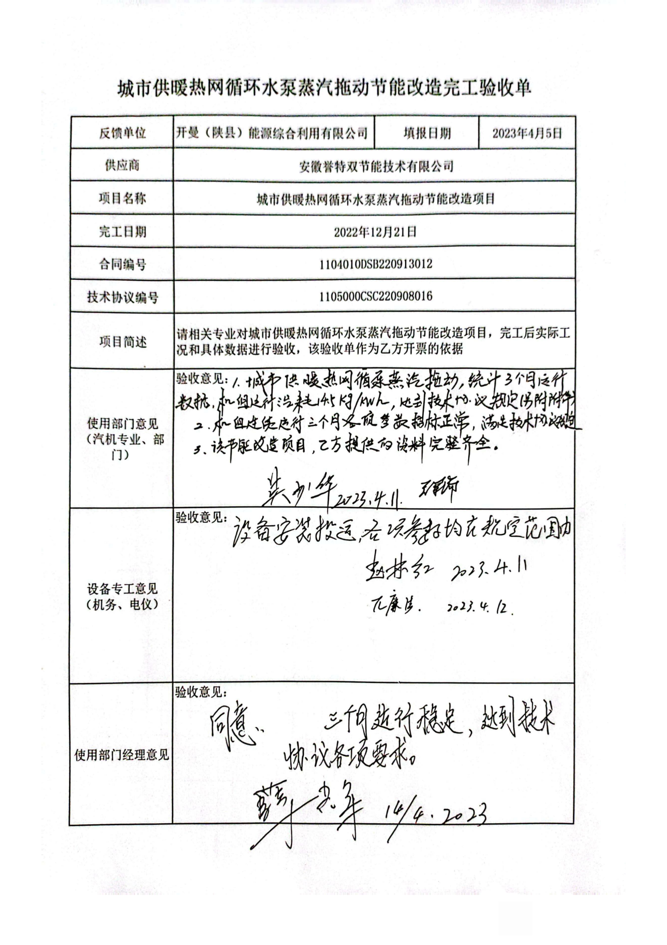 我公司以總包方式承接的——中國(guó)五百?gòu)?qiáng)錦江集團(tuán)三門(mén)峽開(kāi)曼能源3.15MW城市供暖熱網(wǎng)循環(huán)水泵蒸汽背壓拖動(dòng)節(jié)能改造項(xiàng)目,于2022年12月20日一次性開(kāi)機(jī)沖轉(zhuǎn)成功,高效汽輪機(jī)組替代電動(dòng)機(jī)拖動(dòng)循環(huán)水泵運(yùn)轉(zhuǎn),經(jīng)過(guò)三個(gè)月的不間斷持續(xù)運(yùn)行,機(jī)組各性能指標(biāo)均達(dá)到設(shè)計(jì)參數(shù),運(yùn)行正常穩(wěn)定,創(chuàng)造節(jié)能效益,現(xiàn)已通過(guò)工程驗(yàn)收,標(biāo)志著我公司在蒸汽拖動(dòng)節(jié)能技改領(lǐng)域又建立一項(xiàng)標(biāo)桿業(yè)績(jī),歡迎廣大潛在用能單位蒞臨考察指導(dǎo)工作,節(jié)能環(huán)保,合作共贏!