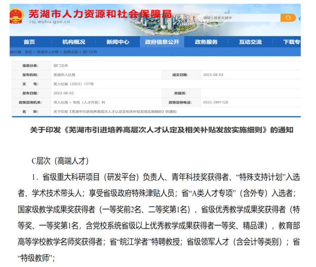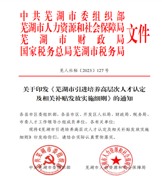 根據中共蕪湖市委組織部、蕪湖市人社局、財政局、稅務局聯(lián)合發(fā)布的《蕪湖市引進培養(yǎng)高層次人才認定及相關補貼發(fā)放實施細則》文件。